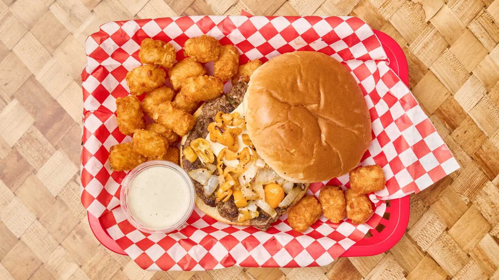 Ranch Dressing, Onions Rings, Jalapeno Poppers, Cheddar Cheese, Lettuce, Tomato, And Pickles
