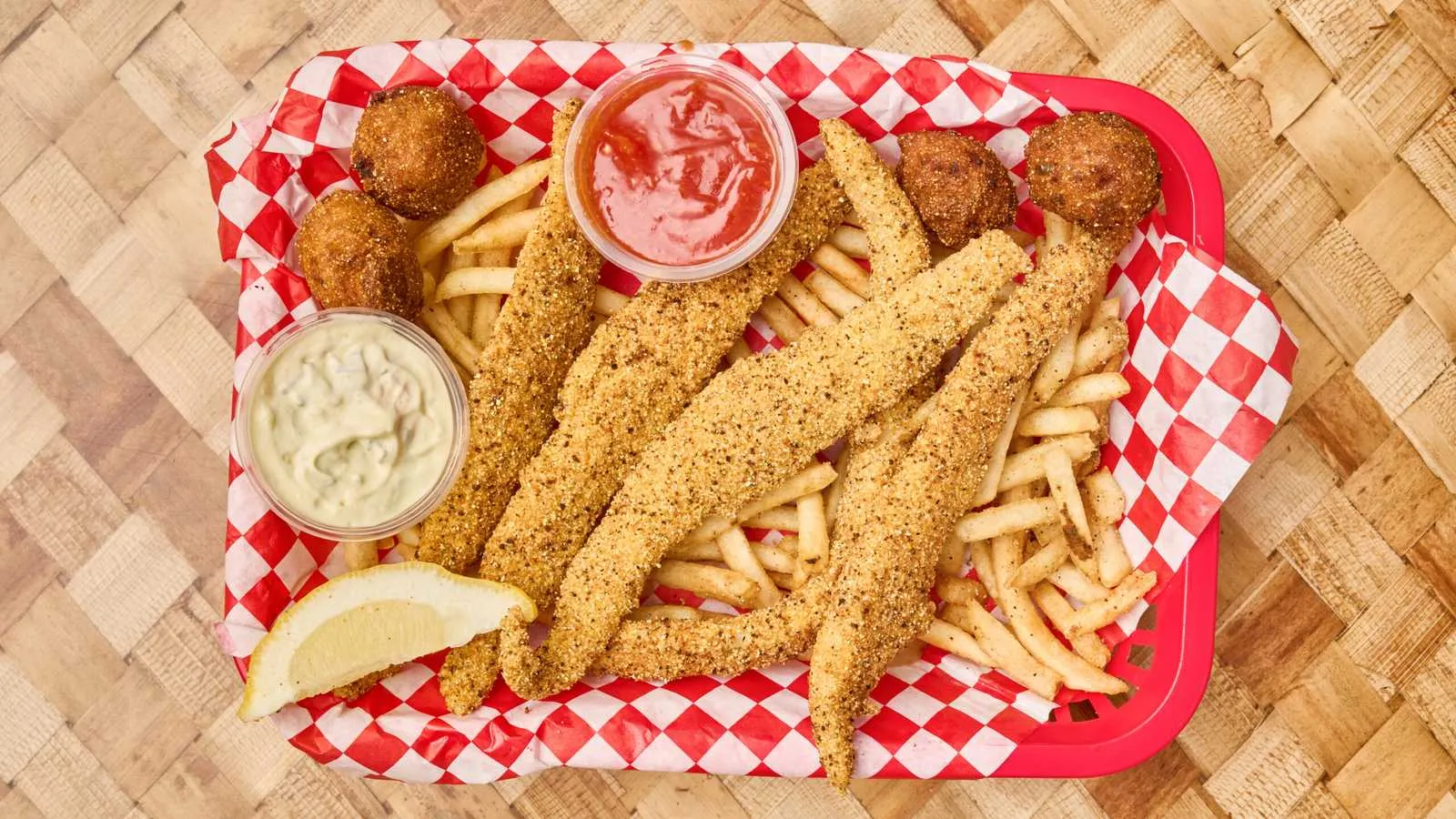 Fried Catfish, Hush Puppies, Tarter Sauce, Cocktail Sauce, Lemons And French Fries